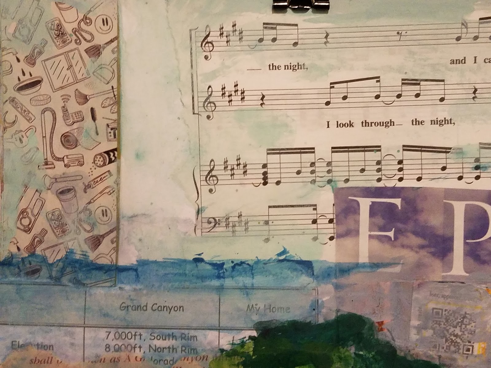 On the tiny table in my employee dorm room, I set up some my art supplies and began a small sketch of Michael looking at the Grand Canyon at sunset. I also began the background of the painting on my XL Canson Mixed Media pad, using a combination of acrylic paint and collage materials. Even though I travel around the country, I try to carry some art supplies with me. It might seem like "too much" to carry bits of collage fodder, but these seemingly insignificant things play an important part of my art journaling process. It feels worth it to carry some of these scraps along with my paints, pencils, art pads, etc.
